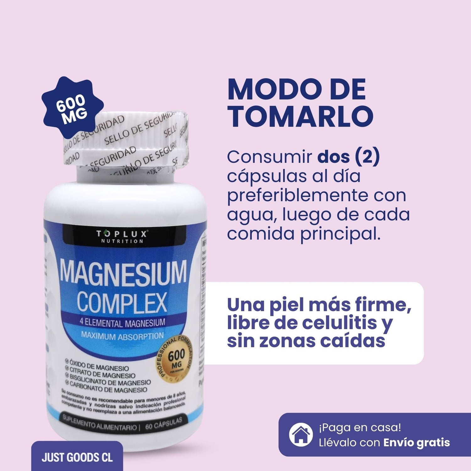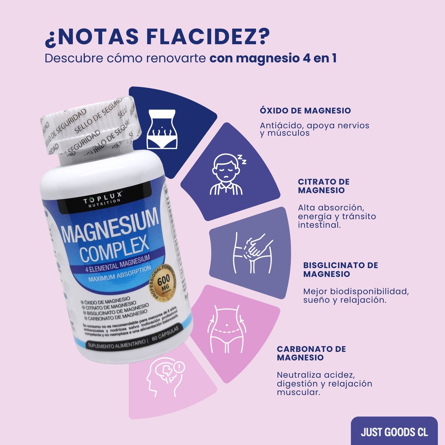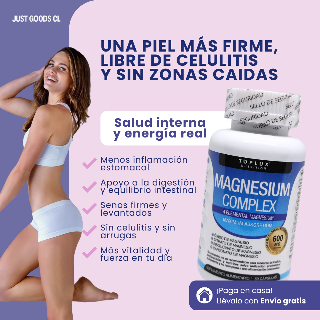 Descubre por qué Magnesium Complex 4 en 1 es el aliado perfecto para mujeres que quieren recuperar la firmeza de su piel, levantar glúteos y senos de forma natural, y decirle adiós a la celulitis sin complicaciones.
